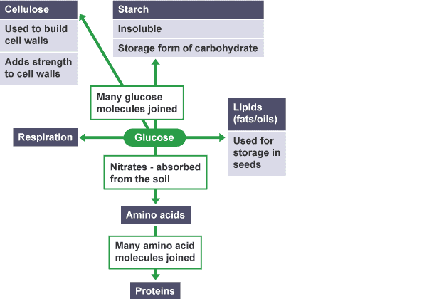 This diagram shows the plant’s metabolism of glucose for making starch and cellulose, respiration, amino acids, proteins, and lipids (fats and oils).