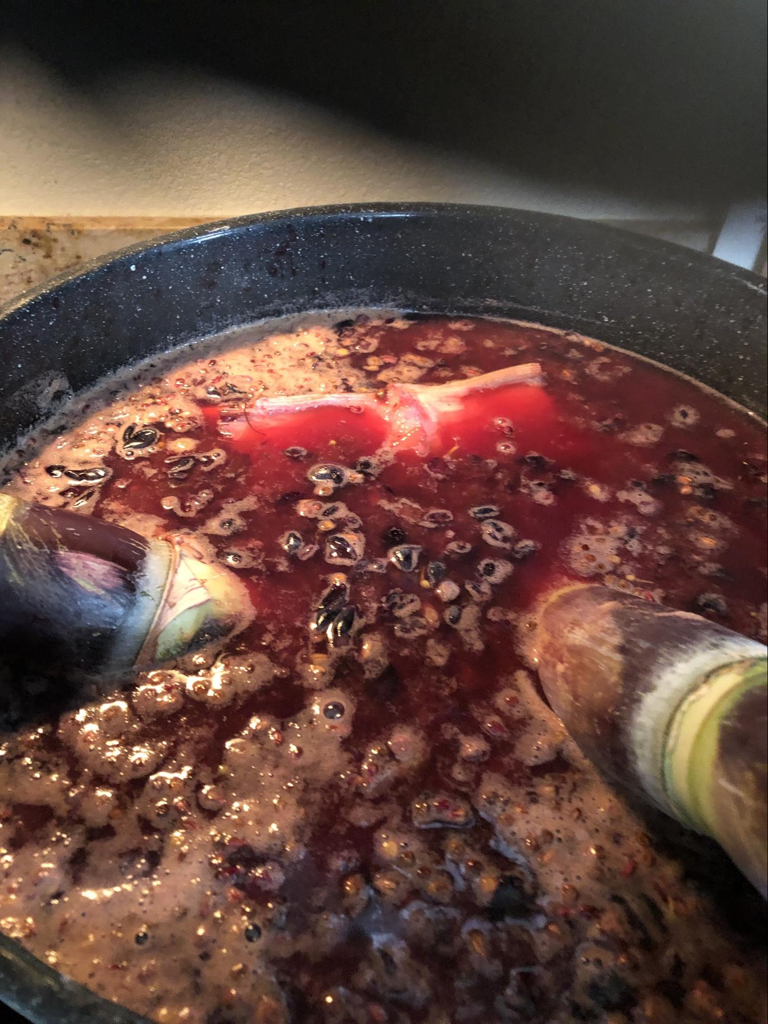This picture shows a big pot of freshly picked purple grapes boiling with sugarcane pieces used as stirring sticks/mashers to make sweet grape juice.
